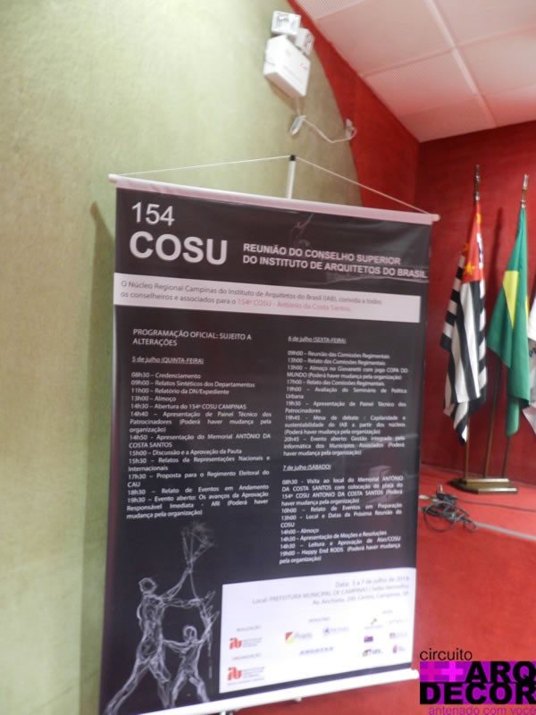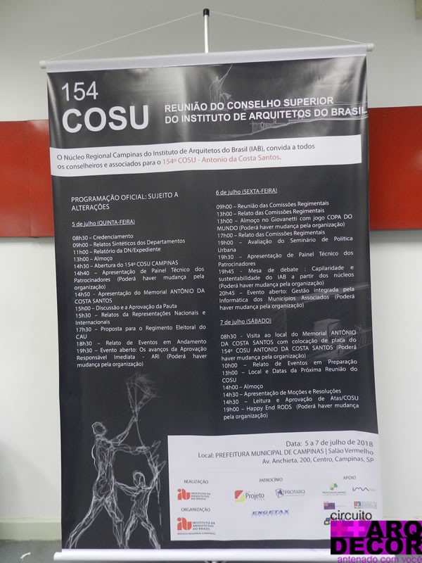 Neste mês de julho, de quinta-feira 05/07 ao dia sábado 07/07 no salão vermelho da prefeitura de Campinas foi realizado o 154° COSU organizado pelo Núcleo Regional Campinas do Instituto de Arquitetos do Brasil (IAB).